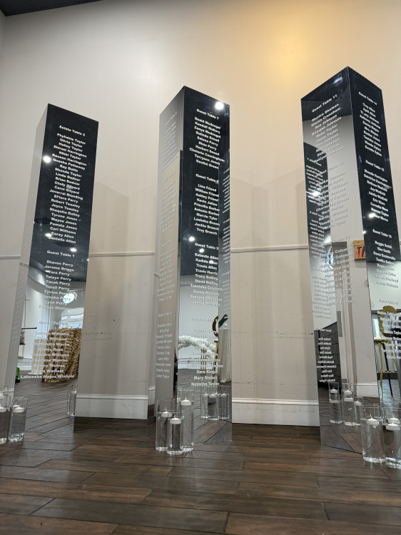 Imagine towering pillars standing proudly, transforming any event into a scene of grandeur. At 7 feet tall, these wood and acrylic masterpieces offer a sleek and modern touch, perfect for supporting elegant decor or dramatic lighting effects. They're versatile, fitting seamlessly into weddings, parties, or photo opportunities, creating a sophisticated backdrop that captures the spotlight. As rental items, they provide a cost-effective solution for elevating the visual appeal of any venue without the permanent commitment. Custom wording is addition cost.